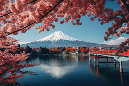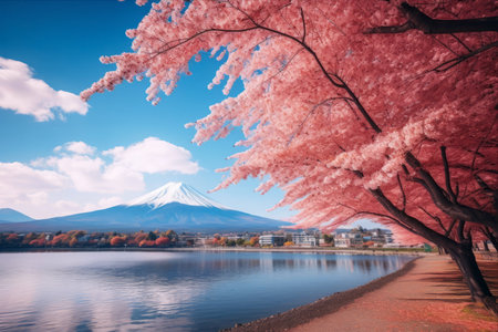 Mt Fuji and Cherry Blossom at Kawaguchiko lake in Japan, Beautiful Fuji mountain and lake landscape view with colorful tree leaves, AI Generated