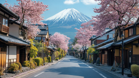 Quiet street with blooming cherry blossom trees leading to Mount Fuji in Japan