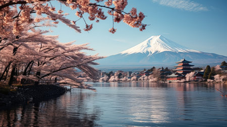 Fuji mountain and cherry blossoms in spring. Generative AI