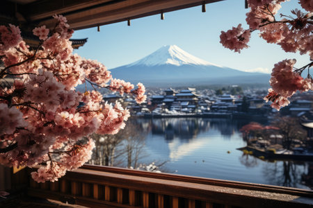 view of Mount Fuji with cherry blossom, and flowers at the lake in japan. Mount Fuji with cherry blossom, flowers at the lake in japan fuji mountain at viewpoint. Generative AI