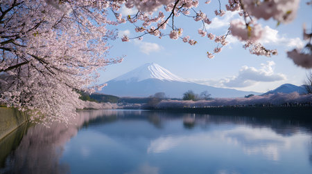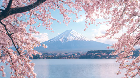 A stunning view of Mount Fuji, framed by delicate cherry blossom trees, captures the tranquil essence of spring in Japan, inviting serenity and beauty.