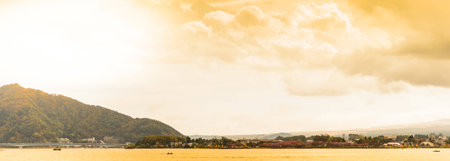 Japan. Panorama of Lake Kawaguchiko. Hotel buildings on the lake. Resorts in Fujikawaguchiko. The nature of autumn Japan. Colorful trees by the lake. Five lakes of Fuji. Kawaguchiko scenery.