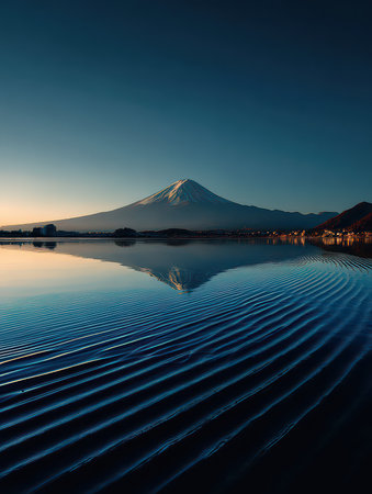 A stunning view of Mount Fuji at dawn, perfectly reflected in the calm waters of a lake. The serene colors and rippling patterns create a tranquil atmosphere, ideal for nature lovers.