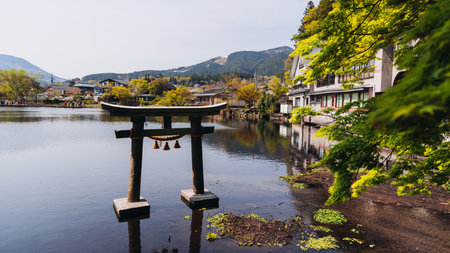 Kinrin lake in Yufuin town, Kinrin-ko lake, Oita prefecture, Japan, hot spring onsen resort town, with mount Yufu, Kyushu island region, rural mountain landscape, a spring day with a blue sky