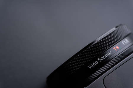 Kuala Lumpur, Malaysia - June 3,2021 : Sony compact or mirrorless camera closeup on black background. Selective focus and crop fragment