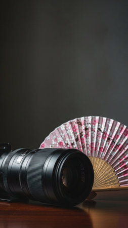 An elegant, vertical still life composition featuring a sophisticated black telephoto camera lens an