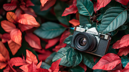 A retro-style vintage camera surrounded by vibrant red and green leaves, creating a lush and artistic composition with a nostalgic feel.