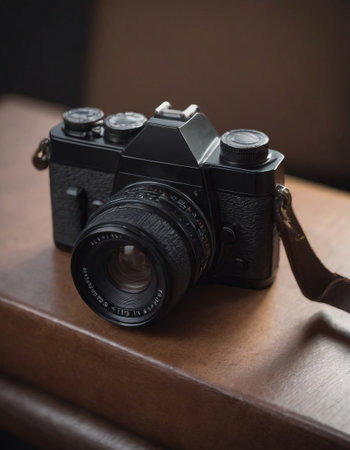 A vintage camera rests on a simple surface, creating dramatic shadows that showcase its elegant details and unique texture.