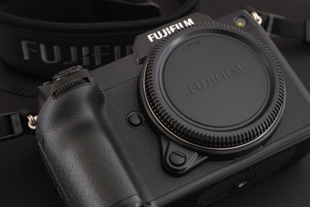 Tambov, Russian Federation - June 29, 2021 Fujifilm GFX 100S medium format camera on a black background. Low key. Close up.
