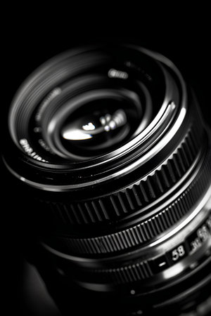 A sharp focus on the reflective glass elements and intricate metal rings of a professional camera lens, showing meticulous craftsmanship and engineering excellence.