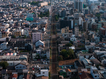 Osaka, Japan - May 21 2024, Panoramic view of a narrow pedestrian street in a residential area of Osaka city. High quality photo