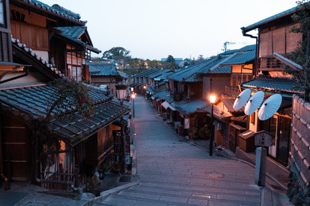 Beautiful traditional streetscape at dusk in Higashiyama district in Kyoto, Japan