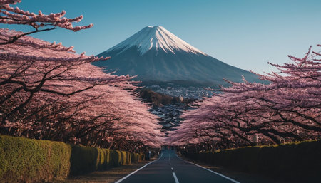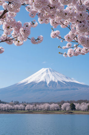 A majestic snow-capped Mount Fuji stands tall in the distance, framed by a vibrant display of delicate pink cherry blossoms. The gentle breeze carries petals through the air, creating a dreamy, ethereal scene.