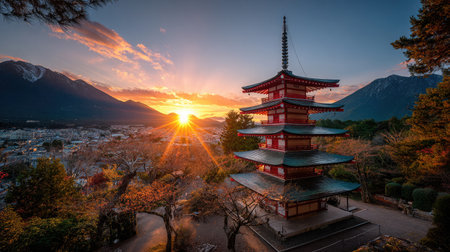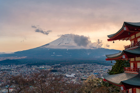 View of the Chureito Pagoda and Mount Fuji landscapes at sunset. Beautiful landscapes, Mount Fujisan view in Arakurayama Sengen Park in Japan