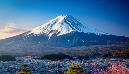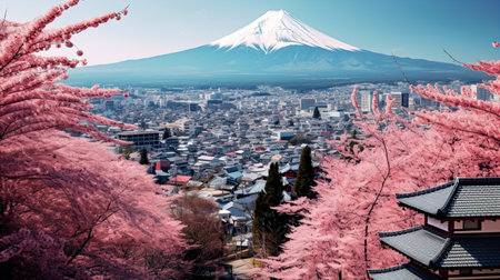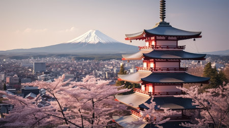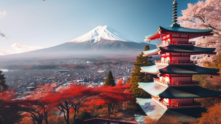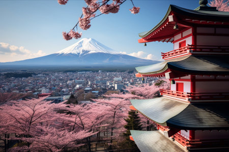 Majestic Mount Fuji, capped with snow, is seen from behind a vibrant cherry blossom tree and a stunning red pagoda in Japan. A picturesque view of the city and the iconic mountain.