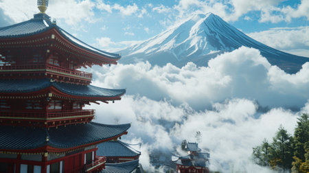 Red Pagoda with Mt Fuji Generative AI