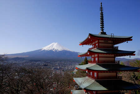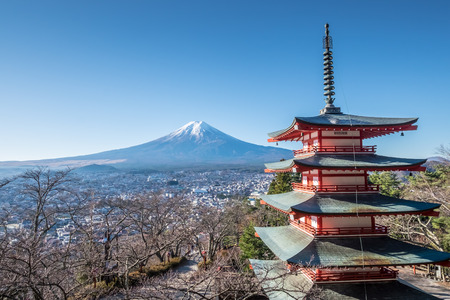 View on Chureito Pagoda and mountain of the mountains Mt Fuji, Japan, captured on a clear, sunny day in winter. Top of the volcano covered with snow. Trees aren't blossoming yet. Postcard from Japan.