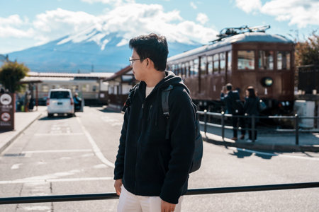 man tourist with Fuji Mountain at Kawaguchiko train station, happy Traveler sightseeing Mount Fuji in Yamanashi, Japan. Landmark for tourists attraction. Japan Travel, Destination and Vacation