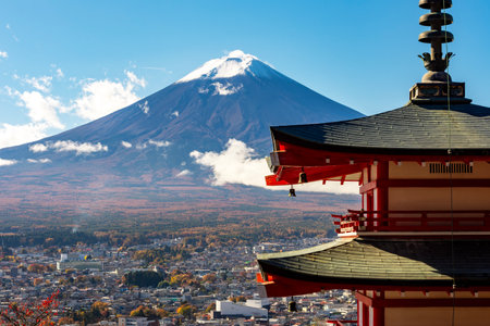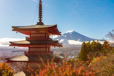 Mt. Fuji with red pagoda in autum, Fujiyoshida, Japan