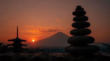 Zen stones sunrise mountain silhouette temple orange sky tranquil balance nature landscape