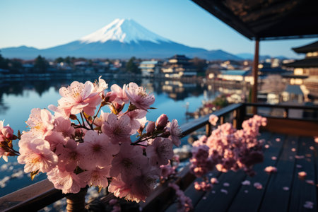 view of Mount Fuji with cherry blossom, and flowers at the lake in japan. Mount Fuji with cherry blossom, flowers at the lake in japan fuji mountain at viewpoint. Generative AI