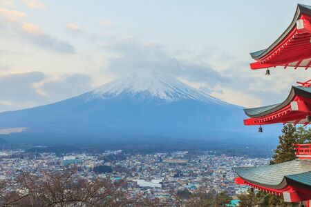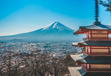 Mt. Fuji with red pagoda in winter, Fujiyoshida, Japan