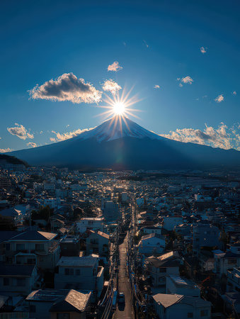 Stunning view of Mount Fuji at sunset, featuring a starburst effect over the peak. The urban landscape below enhances the beauty of this iconic Japanese scenery.