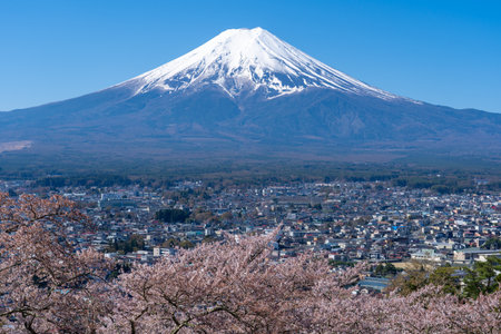 Japan - April 14. 2019 : Cityscape of Fujiyoshida City with Fuji Mountain Background and Cherry Blossom in Springtime, Fujiyoshida, Kawaguchiko, Yamanashi