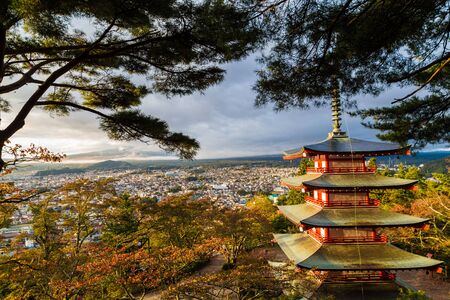 Chureito pagoda at sunset in autumn season on Mt.fuji background. Point view of Mt.Fuji at Kawaguchiko.