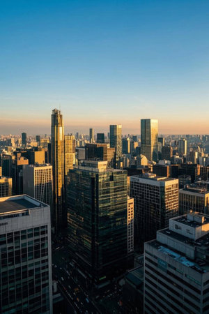 Aerial view of downtown cityscape at dusk with modern skyscrapers and urban landscape, capturing the moody atmosphere of the sunset glow over the metropolitan skyline