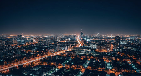 A panoramic view of a city skyline at night, with illuminated skyscrapers creating a dazzling display against the dark sky, symbolizing urban vibrancy.