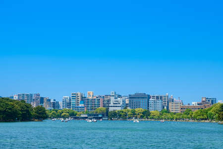 view of city town skyline over the pond lake natural view under daytime in japan, big city with natural lake public park in sunshine day