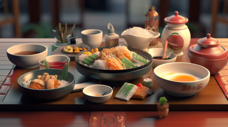 3d illustration of japanese food on the table. 3d rendering