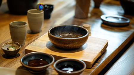 A serene Japanese dining setup highlights a steaming bowl surrounded by minimalist tableware. The natural backdrop creates a tranquil atmosphere for a delightful meal experience.