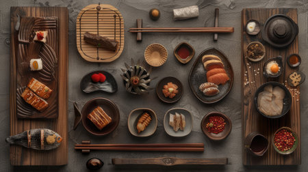 various Asian delicacies, arranged meticulously with negative space for added aesthetic appeal