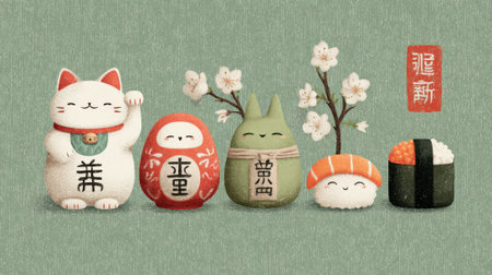 A collection of adorable characters representing Japanese culture stands side by side. The charming figures include a cat, daruma doll, and various sushi inspired designs, enhanced by cherry blossoms.