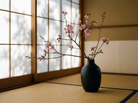 Delicate pink cherry blossom branches are elegantly arranged in a matte black ceramic vase, placed on a textured tatami mat floor.