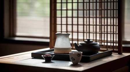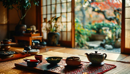 Traditional Japanese tea set in serene setting