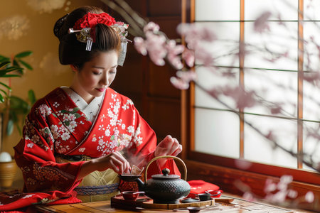 Japanese girl in a kimono, tea ceremony and cherry blossom