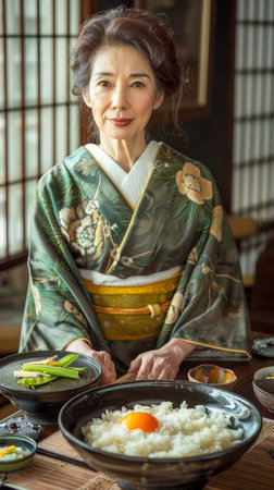 Elegant Mature Japanese Woman in Traditional Kimono with Healthy Breakfast Table Setting AI Generative