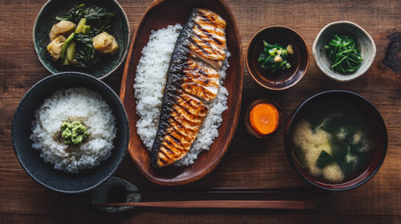 A picturesque serving of a traditional Japanese breakfast with rice, miso soup, and grilled fish