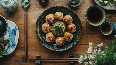A beautifully arranged takoyaki dish placed on a wooden table, accompanied by chopsticks and traditional Japanese tea, creating a cozy and authentic dining experience