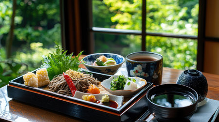 A beautifully arranged plate showcasing traditional Japanese soba noodles accompanied by vibrant vegetables, tea, and a serene natural backdrop.