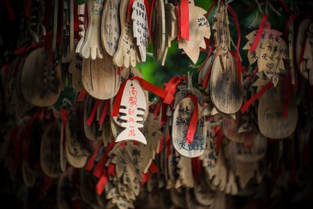 Close up Ema are small wooden plaques, common to Japan, in which Shinto and Buddhist worshippers write prayers or wishes in Hokkaido Shrine in Sapporo. Hokkaido, Japan.