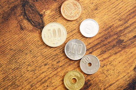 Japanese Yen Banknotes and Japanese Yen coin shot stack layers on floor. japanese currency. financial and economy money concept.