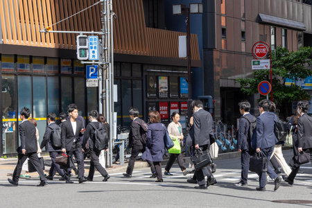 Nagoya, Japan- 9 May, 2024: Working adults cross the road in Nagoya, Japan. With almost 9 million people Nagoya is the 3rd largest metropolitan area in Japan