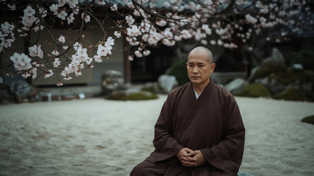 Buddhist monk sitting on the sand in front of the cherry blossoms