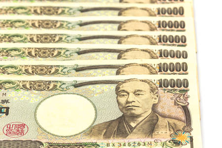 Japanese Yen banknotes on white background.