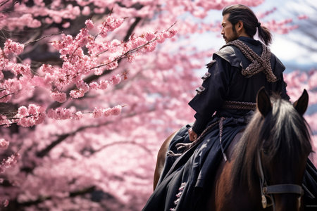 Samurai stands near cherry blossom tree. AI generated