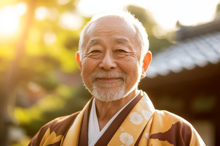 Asian elderly man in traditional kimono outdoors